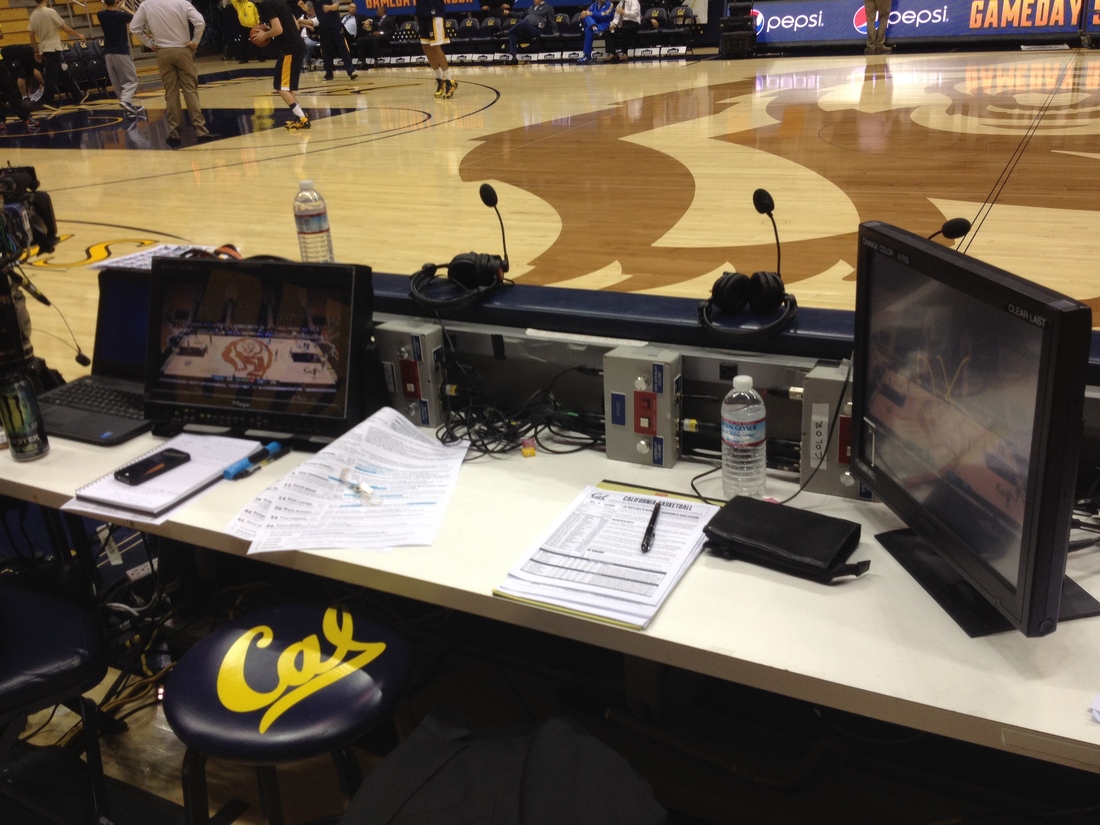 Inside Haas Pavilion, events were approaching the National Anthem and player introductions. In production terms? Silence and darkness. Getting to tip off was hectic. Were we going to get Adamson on camera before or after intros? Would she have a camera on her or should we just mic her in? Is MacLean doing keys to the game? Through this deliberation, I was listening and trying to decipher which camera was which on the multitude of screens before us. Through my headset I was tapped into just about every available microphone that was ‘open’ (that’s me dropping some industry lingo I picked up).
