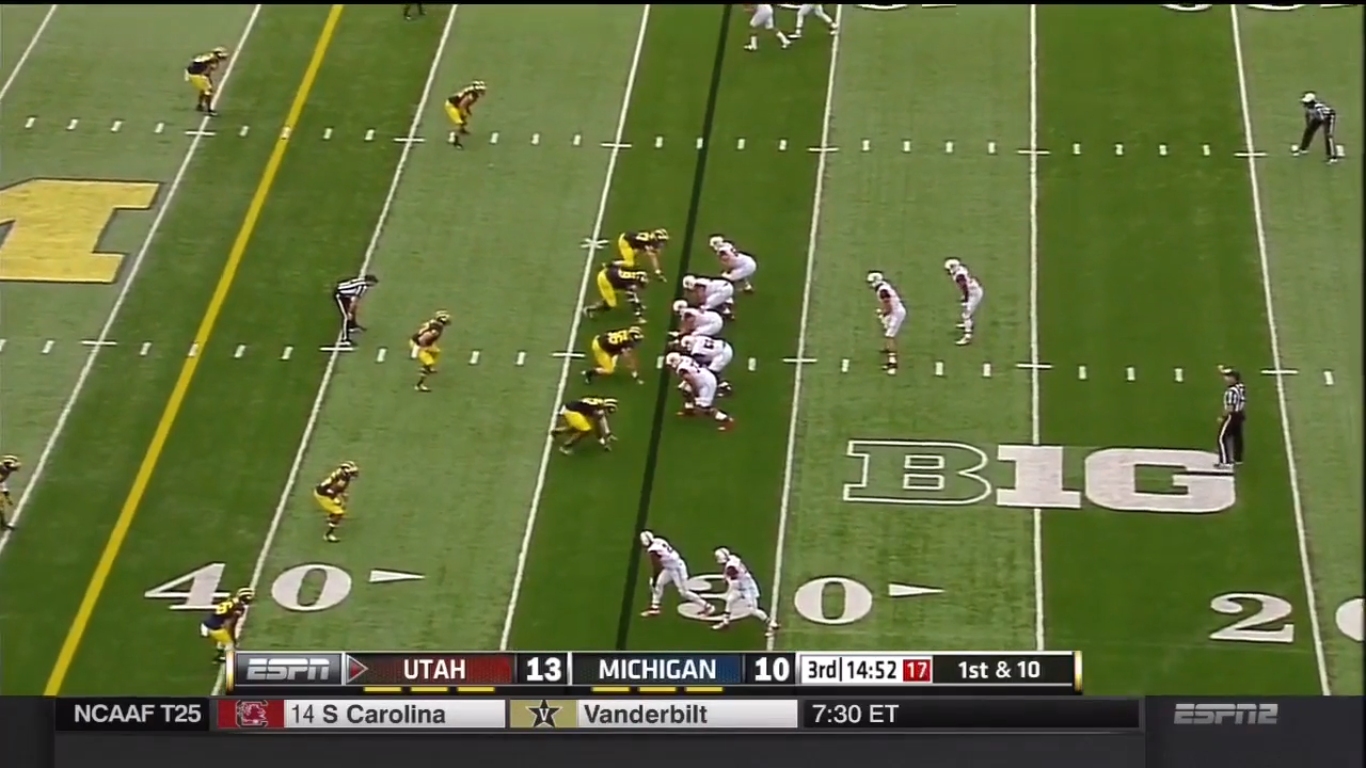 As seen above, the Utes put five men on the line, but the bottom defender drops back to cover. The linebackers rush on a double b-gap blitz, in the gap between the tackles and guards. Doing this leaves the defensive backs in a cover 0, man coverage all the way across. Without a quick pass rush, Devin Gardner could get off a quick pass ostensibly.